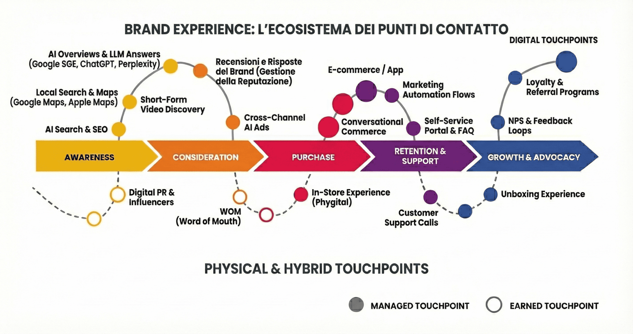Nel 2025, la brand experience rappresenta l’intero ecosistema di interazioni che un utente vive con un marchio. Non si limita al sito web o ai social media, ma inizia molto prima: sui motori di ricerca, nelle mappe, nelle recensioni online e persino nelle AI Overviews di Google.